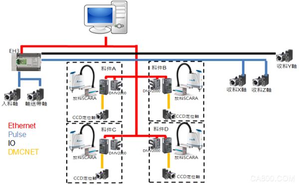 控制操作由主機DVP-EH3發(fā)送脈波與I/O觸發(fā)到各運動軸,控制入料、輸送帶收料XYZ平臺動作,可達成準確定位效果。由于采用脈波命令,臺達伺服可輕易配合客戶舊設備應用,而不需進行設備大幅度修改。DVP-EH3與上位機使用Ethernet通訊,可及時修改D區(qū)資料,更改PLC動作更為方便??刂撇僮魅鐖D3所示。