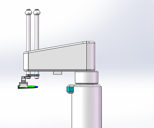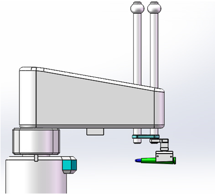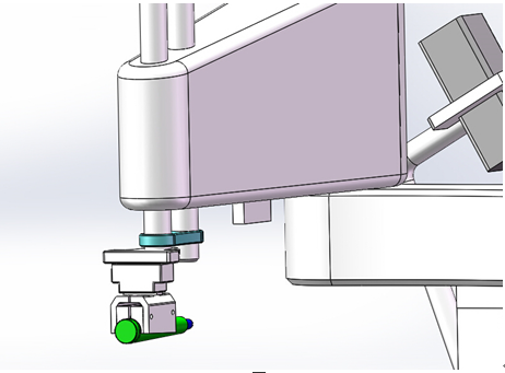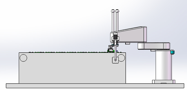 Scara平面關(guān)節(jié)機(jī)器人負(fù)責(zé)搬運(yùn)和動(dòng)作的實(shí)施,落實(shí)槍械子彈的姿態(tài)糾正和從來(lái)料輸送鏈抓取子彈并將糾正姿態(tài)后的子彈運(yùn)送和碼垛到彈夾上。
