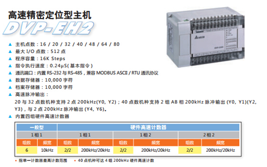 PLC采用臺(tái)達(dá)高速精密定位型EH系列主機(jī),性能穩(wěn)定,功能強(qiáng)大,運(yùn)算速度快,程序和數(shù)據(jù)存儲(chǔ)量大,支持多種通訊方式。