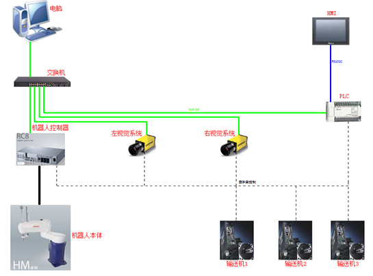 如上圖所示,機(jī)器人控制器,2臺(tái)視覺(jué)系統(tǒng),PLC全部進(jìn)交換機(jī)。如果,有需要交換機(jī)可以進(jìn)PC,采集和控制機(jī)器人、視覺(jué)系統(tǒng)、PLC。同時(shí),在本地PLC與HMI通訊。終上即可以實(shí)現(xiàn)本地控制,也可以實(shí)現(xiàn)遠(yuǎn)程控制與監(jiān)控。