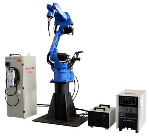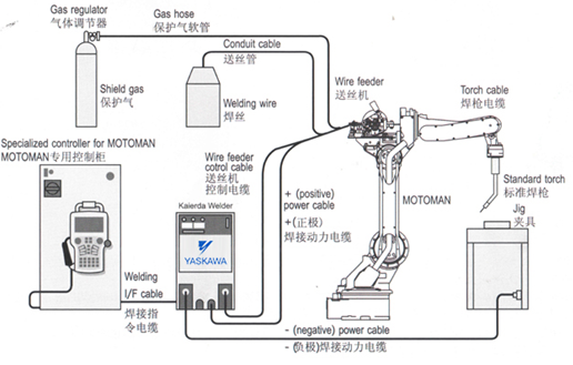 ? 系統(tǒng)組成:6軸關節(jié)機器人、焊接電源、焊槍、送絲機等。配備電弧跟蹤系統(tǒng)、機器人弧焊、起始點跟蹤、多層多道焊接系統(tǒng)。