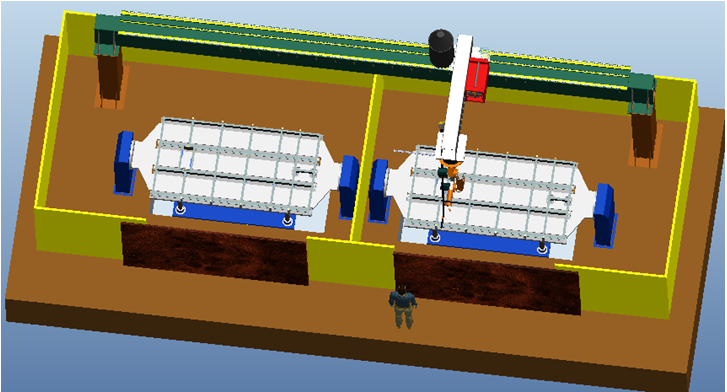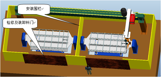 將所有運動設計布置與圍欄內(nèi),可以為工人及其他相關人員提供一個安全可靠的工作環(huán)境。圍欄布置有檢修和人工上料門,布置必要的檢測開關,并與整套控制系統(tǒng)聯(lián)動,在設備正常工作時,假如有人員闖入,將立即停止所有設備的運轉,確保人員安全。其分為兩個獨立部分,集體結構見下圖。這樣可以將兩個工位分成獨立的兩個工作空間,使得人工裝卸料和焊接分開獨立運行,互不影響。