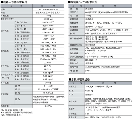 本系統(tǒng)選用MOTOMAN六軸工業(yè)機器人,荷重10kg,工作半徑R2010mm,包括機器人本體、機器人控制柜、示教盒、變壓器及供電電纜等。