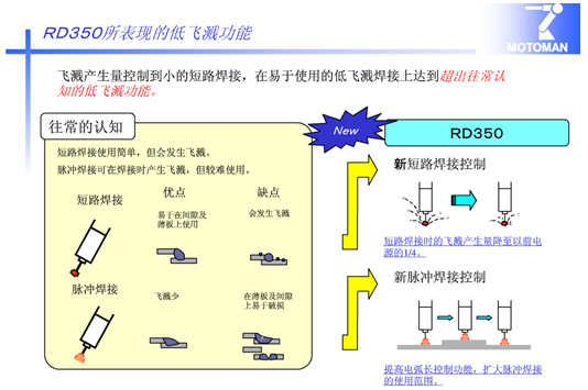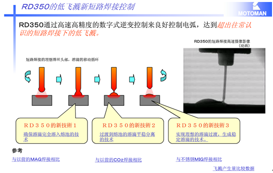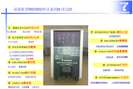 采用超低飛濺全數(shù)字化機器人專用焊接 電源RD-350。此電源具有如下特點: