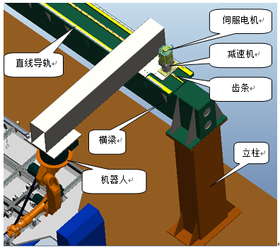 外部移動軸為機器行走機構,實現(xiàn)不同工位弧焊機器人的位置變換、同時在長度方向上適應工件的焊接范圍。此機構采用伺服電機驅動,齒輪齒條傳動,直線導軌導向,機架采用桁架結構,其采用型鋼焊接,分段制造、整體組裝。具體結構見下圖。