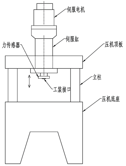 1. 伺服壓機(jī)由壓機(jī)底座、立柱、壓機(jī)頂板、伺服電缸、伺服電機(jī)、伺服驅(qū)動(dòng)、力傳感器、觸摸屏、PLC、光幕、低壓元器件及控制柜等組成。位移值通過伺服電機(jī)及伺服缸精確控制,擠壓過程中的阻力由力傳感器直接檢測;通過力、位移值的采集,以及外部固有參數(shù)(工裝號(hào)、粉末重量等)的輸入,可以實(shí)時(shí)反應(yīng)力、位移及密度三者的對(duì)應(yīng)變化曲線。此外壓機(jī)設(shè)置有光幕,以確保實(shí)驗(yàn)過程中人員的安全。
