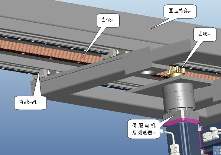 傳動(dòng)系統(tǒng)采用齒輪齒條傳動(dòng),并配置臺(tái)達(dá)伺服電機(jī)及新寶減速器。齒輪齒條運(yùn)動(dòng)平穩(wěn)可靠,并且性價(jià)比極高,此設(shè)計(jì)可以有效減輕甲方的采購(gòu)成品。
