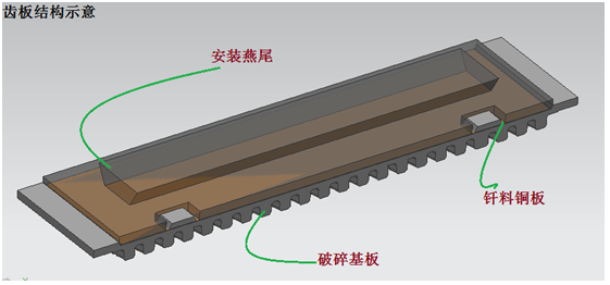 齒板由破碎基板、釬料銅板和安裝燕尾三部分組成,完成品重量不超過75KG。其中基板約15~20KG、銅板約1.5~2.5KG、燕尾約25~35KG。