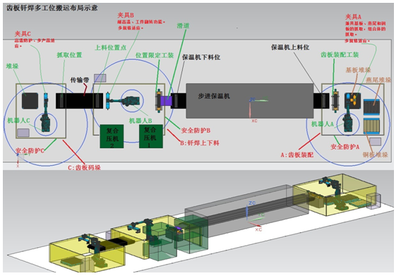 通過機器人A攜三功能夾具、配合“裝配工裝”實現(xiàn)對基板、銅板和燕尾的分別抓取及定位組合,完成組合的齒板由機器人將其從“裝配工裝”上搬運至“步進(jìn)保溫機的上料口”。