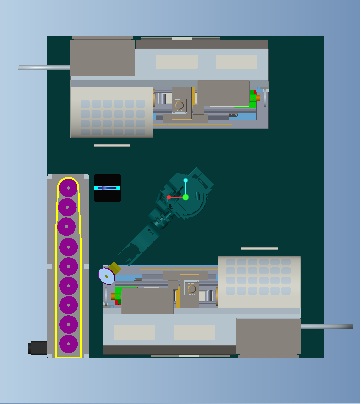 方案設(shè)計采用優(yōu)化設(shè)計為盡可能提高效率,采用雙來料倉和出料倉(示意圖1),讓機(jī)器人盡量就近取料和放料,方案做的輸送來運(yùn)送工件,在輸送線的末端做工裝定位,采用機(jī)械式保證設(shè)定原點(diǎn)。備用方案可做旋轉(zhuǎn)料架和視覺系統(tǒng)來抓取工件原點(diǎn),相對于機(jī)械式成本更高。