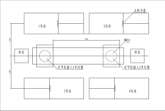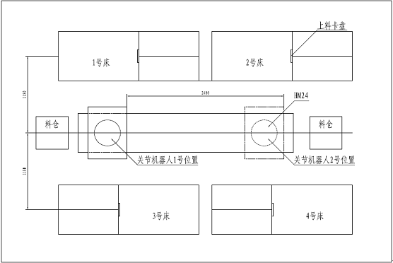 CK6140機(jī)床機(jī)械手上下料方案是機(jī)械人、機(jī)床、電氣和各種檢查手段于一體的綜合性的項(xiàng)目,各個部件有條不紊的工作相互協(xié)作,完成產(chǎn)品的生產(chǎn)。布局如圖1: