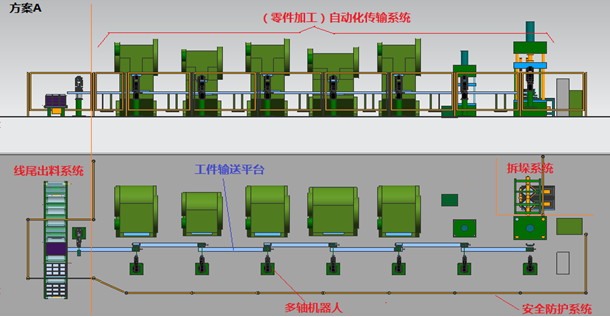 方案A:壓機(jī)上下料使用多軸機(jī)器人。
