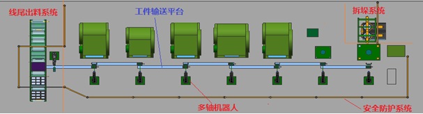 方案示意圖中物料的流向?yàn)閺挠抑磷螅从覀?cè)板料上線、經(jīng)自動(dòng)拆垛后上線加工、左側(cè)為線尾出料部分。