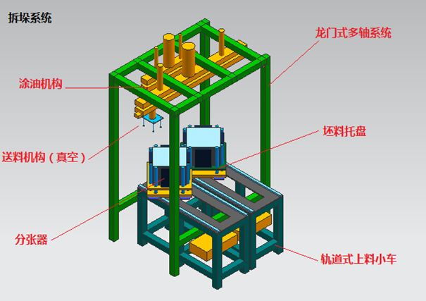 該系統(tǒng)主要包括軌道式上料小車、帶有分張器的可升降托盤、龍門式多軸系統(tǒng)、涂油機(jī)構(gòu)、送料機(jī)構(gòu)和控制系統(tǒng)等組成。