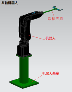 多軸機(jī)器人的顯著特點(diǎn)是柔性極高、適用范圍廣。本方案涉及零件重量~500克,考慮夾具的自重及加長臂等因素,初步選定5KG級(jí)加長臂機(jī)器人。同時(shí)為了讓機(jī)器人工作在理想的高度位置需要給其加固定座。