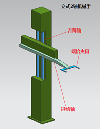 該立式機(jī)械手結(jié)構(gòu)簡單主要由升降軸和進(jìn)給軸兩部分組成,配合端拾夾具組合后實(shí)現(xiàn)上下料動(dòng)作。