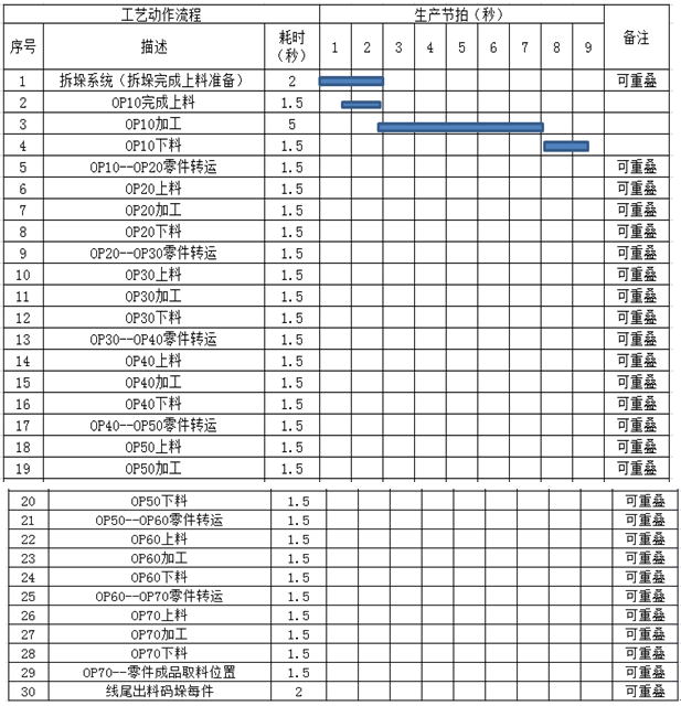 受制于OP10工序、其余各工序在加工時(shí)會(huì)不同程度的出現(xiàn)等待的情況、當(dāng)然可以通過調(diào)整速度的方式對(duì)整過生產(chǎn)線的生產(chǎn)做均衡處理。