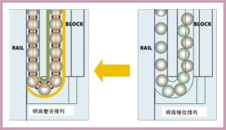 因滾動直線導(dǎo)軌里的鋼珠產(chǎn)生彈性變形而吸收安裝面誤差從而可以降低導(dǎo)軌安裝基礎(chǔ)面的平整度要求,降低機(jī)械加工成本。