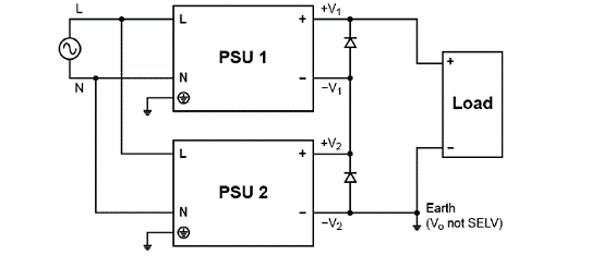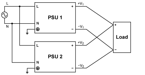 電源可以串聯(lián),以增加輸出電壓,如圖5所示。注意,只能使用來自同一產(chǎn)品系列、同等額定輸出電流的電源?! ?br/>選擇電源時還需注意,電流負(fù)載不得超過低額定輸出電流。原則上,串聯(lián)電源數(shù)量不限,但系統(tǒng)設(shè)計師必須留意,輸出電壓> 60Vdc即超出SELV規(guī)定,容易引發(fā)危險。任何情況下,總電壓都不得超過150Vdc。當(dāng)總電壓超出SELV限定的60Vdc,必須安裝輸出端防觸碰保護(hù)裝置,此外,電源輸出端 (-V2 DC回路) 必須接地,參見圖5?! ?br/>每個電源的輸出端外,必須安裝一個反極性保護(hù)二極管,目的在于防止發(fā)生諸如短路等系統(tǒng)故障時, -V電壓連接到其他電 源。發(fā)生短路情況下,-V1 &+V1將連接至+V2 &-V2,意味著2個電源輸出會以相反極性連接,從而損害電源。安裝壓反極性保護(hù)二極管后,每個電源輸出的電壓將限定在一個二極管降壓之內(nèi),約為0.7V到1.0V。建議提供2倍于串聯(lián)輸出電壓額定值,以為二極管預(yù)留充足降額空間。 舉例說明:將兩個24V 電源串聯(lián),總電壓為48V。發(fā)生短路時,有鑒于通過反極性保護(hù)二極管的電流很高,二極管的反向額定電壓至少應(yīng)為2×48=96V?! ?br/>