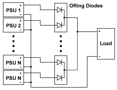 圖 2. 負(fù)載分擔(dān)連接原理圖 (N+1) ORing Diodes是反極性保護(hù)二極管