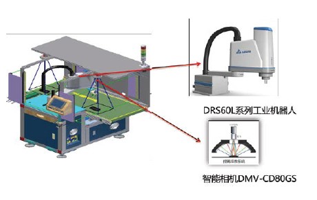 臺達解決方案包括SCARA工業(yè)機器人DRS60L系列、PLC、HMI、智能相機等,其中,SCARA工業(yè)機器人DRS60L系列主要用于追蹤點膠機并進行點膠作業(yè)。由于機器人的靈活性,該解決方案還實現(xiàn)了快速換線且不需要夾具輔助即可完成作業(yè)的功能。