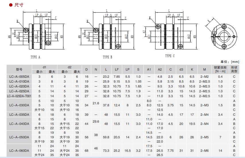 D. 確認對軸向沒有壓縮和牽拉等作用力后,保證有效接觸長度,每個聯(lián)軸器的夾持長度克參考聯(lián)軸器的尺寸,要求大于2倍的C值,小于LF尺寸值。將2個夾緊螺栓鎖緊到所規(guī)定的扭矩。關(guān)于鎖緊扭矩請參照與相應(yīng)鎖緊扭矩一覽表。