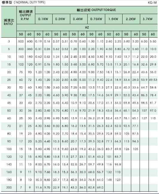 根據(jù)負(fù)載的轉(zhuǎn)速(rpm)和扭矩(kg.m)需求,查詢表格如(表一)。從表格確認(rèn)轉(zhuǎn)速和扭矩,向上看第一行,確認(rèn)電機(jī)的功率,先做看第一列確認(rèn)減速機(jī)的減速比。確認(rèn)這兩個參數(shù)以后,我么進(jìn)行第二部。