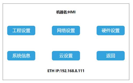 組網(wǎng)示意圖中,主屏和從機(jī)屏IP都設(shè)置成同一網(wǎng)段。主屏下載現(xiàn)場(chǎng)控制程序,從機(jī)屏不用下載任何程序,只要上電,然后長(zhǎng)按右上角5秒,進(jìn)入后臺(tái),“工程設(shè)置”,如下圖: