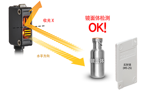 鏡面反射型具有M.S.R. (鏡面抑制)功能,使得傳感器只接收來自特定反射鏡(MS-2S)的光線。 該功能可以穩(wěn)定檢測高反射目標(biāo),包括金屬,鏡子等。