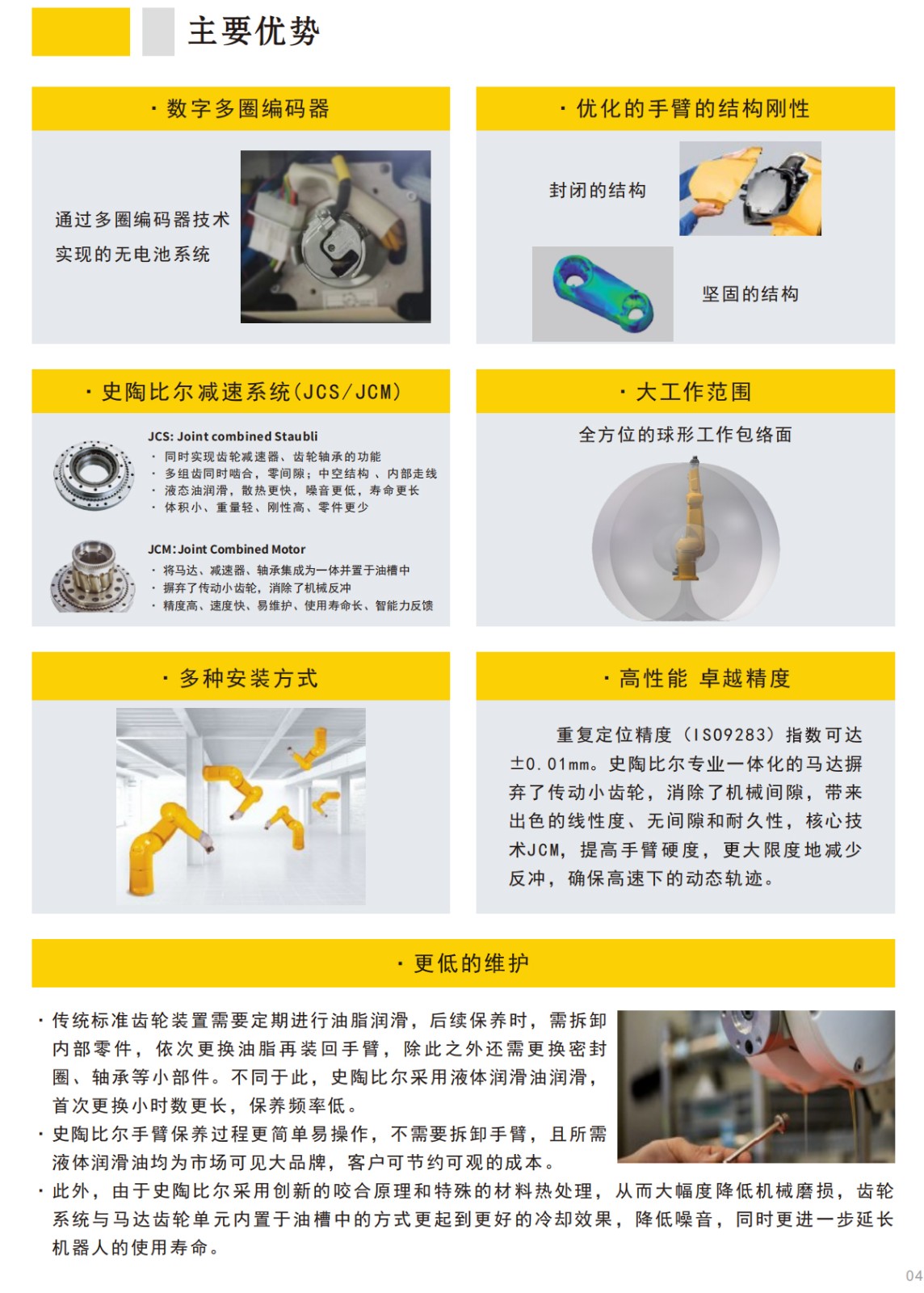 ·數(shù)字多圈編碼器 ·優(yōu)化手臂結(jié)構(gòu)剛性 ·史陶比爾專業(yè)減速系統(tǒng)(JCS/JCM) ·大工作范圍 ·多種安裝方式 ·高性能卓越精度 ·更低的維護(hù)費(fèi)用 staubli