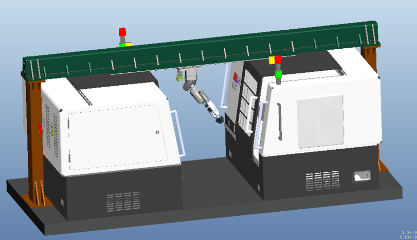 e) 方案二減小目前機(jī)床的間距為700mm甚至更小。優(yōu)點(diǎn)是設(shè)備投入小,缺點(diǎn)是不利于后期機(jī)械手和機(jī)床的維護(hù)。