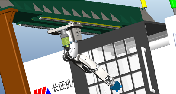 d) 方案一增加機(jī)器人第七軸。優(yōu)點(diǎn)是保證磨床間距不變,缺點(diǎn)是需要提高七軸的精度和增加桁架。