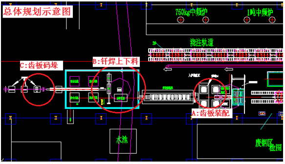 下圖為總體規(guī)劃示意圖,齒板生產(chǎn)過程按如下工位順序展開: