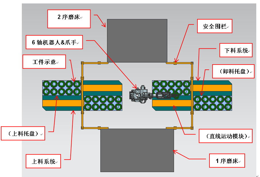 該系統(tǒng)是由(兩序)磨床、1臺6軸20KG機器人,1套上料系統(tǒng),1套下料系統(tǒng),1套圍欄及安全系統(tǒng)及電器控制(下面圖中未作示意)系統(tǒng)(PLC)組成的自動化生產單元。如下所示。