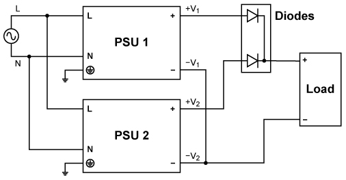電源可以串聯(lián),以增加輸出電壓,如圖5所示。注意,只能使用來自同一產(chǎn)品系列、同等額定輸出電流的電源?! ?br/>選擇電源時還需注意,電流負(fù)載不得超過低額定輸出電流。原則上,串聯(lián)電源數(shù)量不限,但系統(tǒng)設(shè)計師必須留意,輸出電壓> 60Vdc即超出SELV規(guī)定,容易引發(fā)危險。任何情況下,總電壓都不得超過150Vdc。當(dāng)總電壓超出SELV限定的60Vdc,必須安裝輸出端防觸碰保護(hù)裝置,此外,電源輸出端 (-V2 DC回路) 必須接地,參見圖5?! ?br/>每個電源的輸出端外,必須安裝一個反極性保護(hù)二極管,目的在于防止發(fā)生諸如短路等系統(tǒng)故障時, -V電壓連接到其他電 源。發(fā)生短路情況下,-V1 &+V1將連接至+V2 &-V2,意味著2個電源輸出會以相反極性連接,從而損害電源。安裝壓反極性保護(hù)二極管后,每個電源輸出的電壓將限定在一個二極管降壓之內(nèi),約為0.7V到1.0V。建議提供2倍于串聯(lián)輸出電壓額定值,以為二極管預(yù)留充足降額空間。 舉例說明:將兩個24V 電源串聯(lián),總電壓為48V。發(fā)生短路時,有鑒于通過反極性保護(hù)二極管的電流很高,二極管的反向額定電壓至少應(yīng)為2×48=96V?! ?br/>
