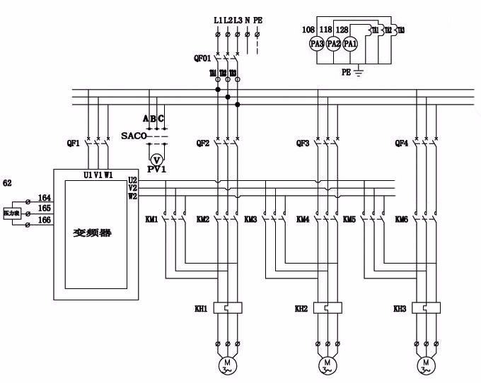 那么變頻器如何實(shí)現(xiàn)一拖多的功能?下面僅僅對(duì)一次電氣原理圖做出示例。二次電氣原理圖需要根據(jù)控制要求設(shè)計(jì),此處暫不贅述。