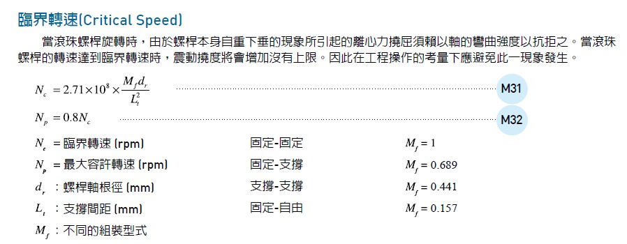 由于絲杠有兩個端頭,分別采用不同的安裝方式時,請對絲杠臨界轉速的影響系數不同,請參考上面的公式。